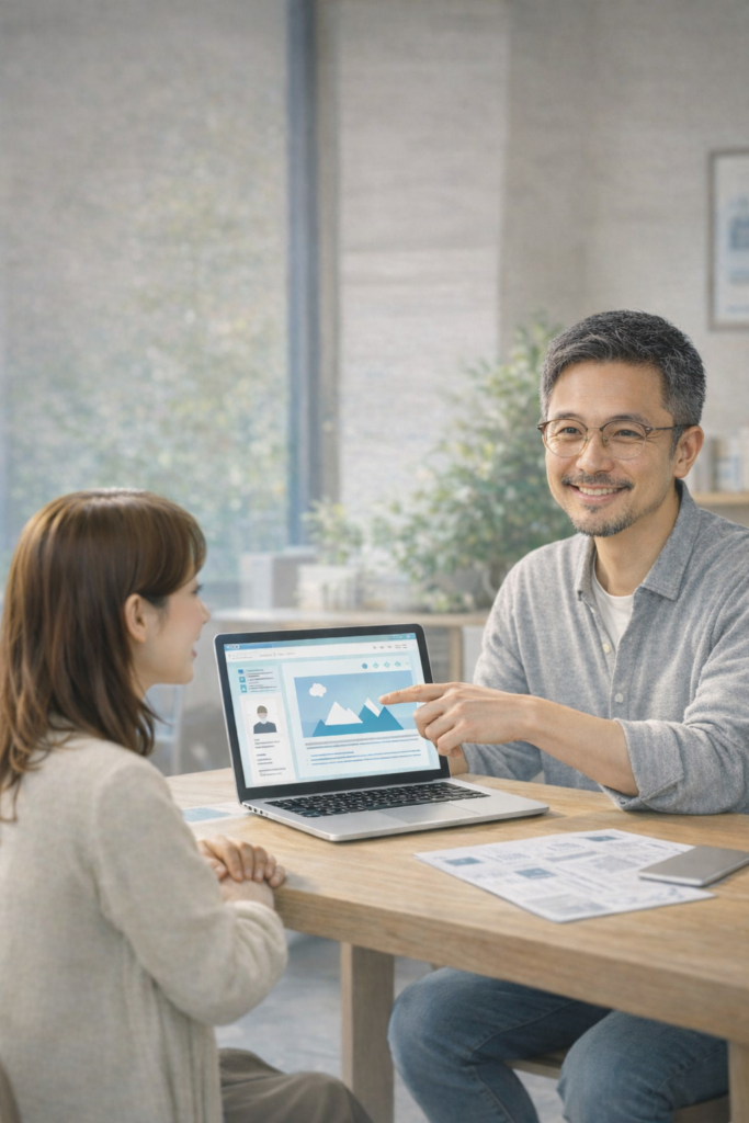 パソコンの基本操作、メール、印刷、ファイル整理など、初心者の方にもわかりやすく説明しながらサポートします。